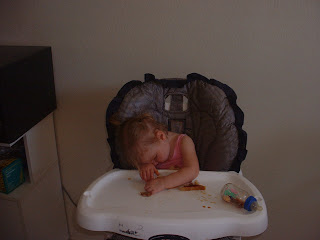 When we got back from the park today, I made Amy a sandwich before her nap time. I put her in her chair and she ate the first half. I was checking my email and noticed she got really quiet. I went back in the kitchen and this is what I found. Then I couldn't find batteries for the camera, so I spent 5 minutes looking for non-dead batteries. It was worth it though! What a cutie!
